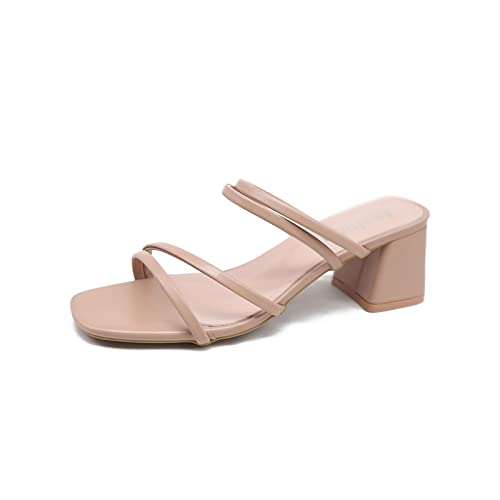 HJBFVXV damespantoffels Women Elegant Sandals Ladies Square Heels Summer Slippers Outside Narrow Band Leather Female Slides Fashion Woman Sandals (Color : Apricot, Size : 41 EU)